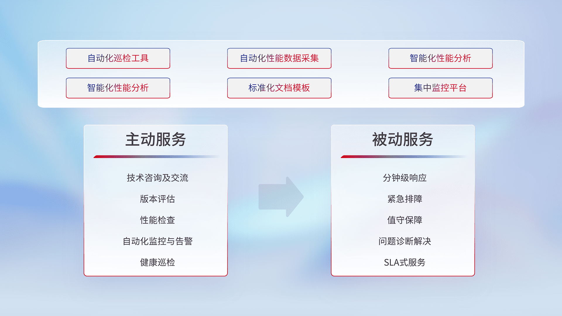 智能化工具和标准化文档,,,,保障服务质量,,提供主动服务(包含技术咨询、、版本评估、、、、性能检查、、、自动化监控与告警、、健康巡检)和被动服务包含(分钟级响应、、、、紧急排障、、、、值守保障、、、、问题诊断解决、、、、SLA服务)。。。