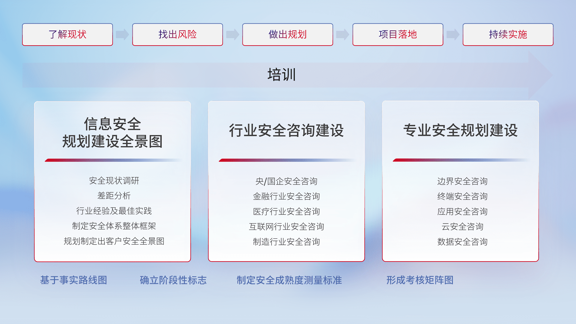 针对客户行业特性,,以专业的安全服务+多厂商联合解决方案提供专属的一站式安全管理服务,,帮助客户全面感知网络空间威胁,,,,基于识别、、、检测、、、、分析、、防护、、、、监测、、、响应的服务理论模型,,,从方案咨询、、、、集成交付、、、、评估验证、、、优化加固、、、运维运营,,,致力于为客户提供完整的闭环管理式安全服务。。以实战经验为客户打造高抵御风险的安全体系,,帮助客户发现威胁、、对抗威胁、、、、处置威胁,,,,不断积累安全对抗能力,,,持续保障数字化安全。。。